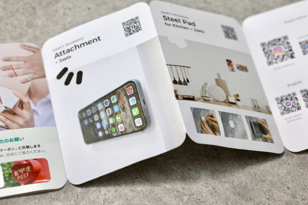 従来製品には付属していたアタッチメントは別売り。これがあればどこにでも、iPhoneを貼り付けられる。また、あらたに、より面積が大きいSteel Padというアクセサリーも用意されたので、安心して壁面に固定できるようだ。