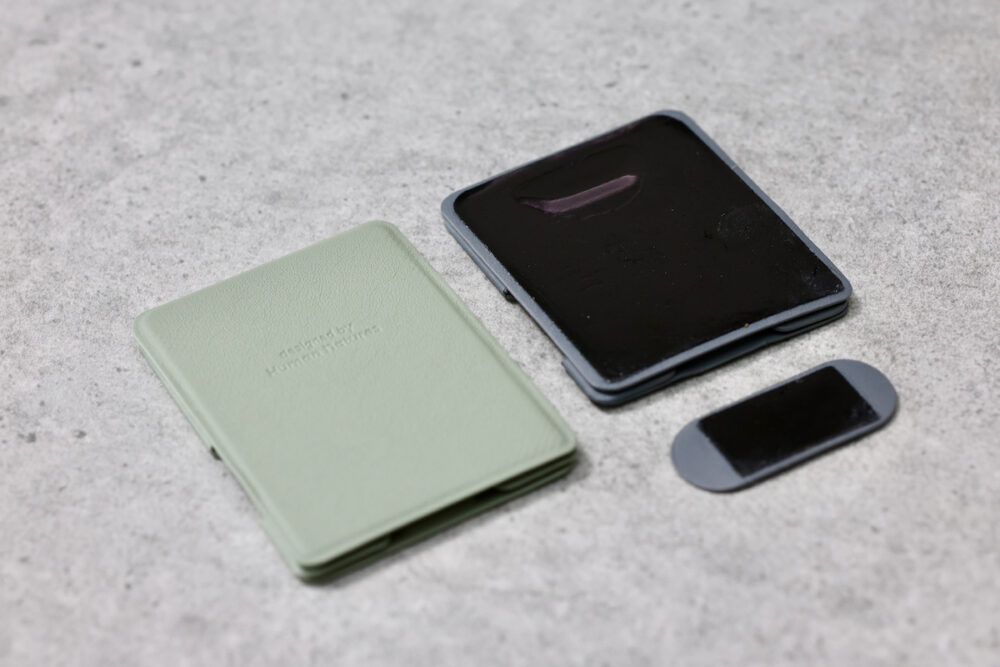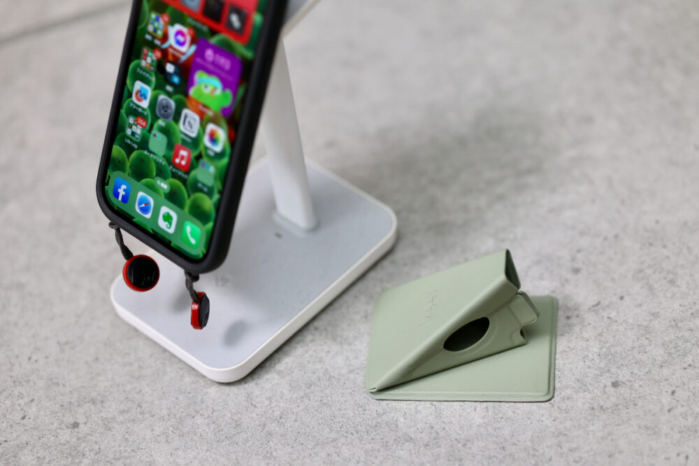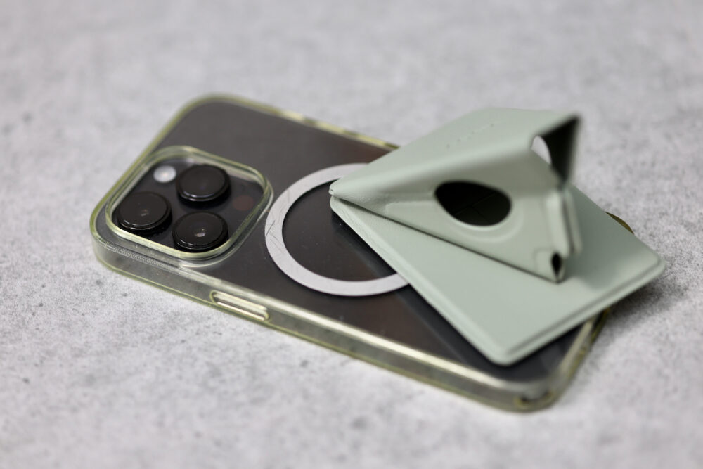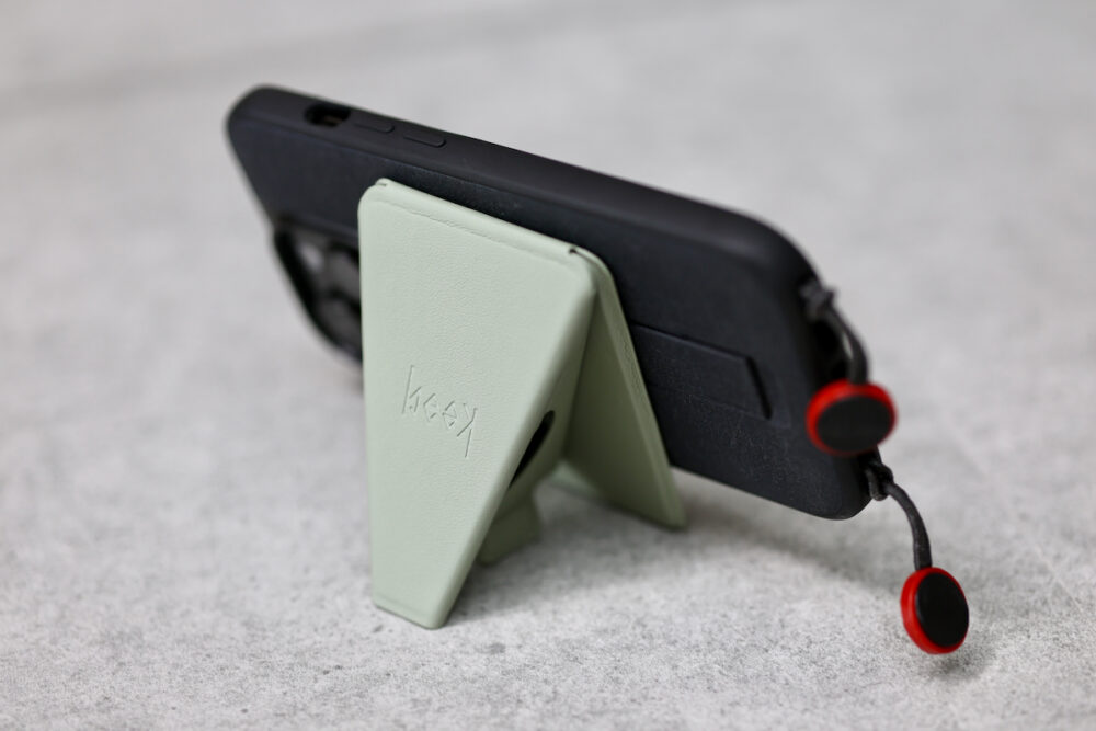 粘着パッドで、何にでも付けられて、張り付いた状態も強固なのがbeak。MagSafe非対応のケースやスマホにも使える。