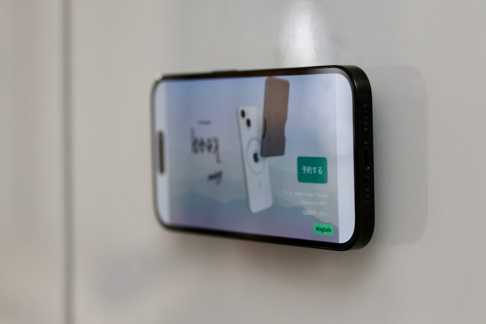 以前のモデル同様、マグネットがくっつく冷蔵庫など、鉄製の壁面ならスマホを貼り付けられる。