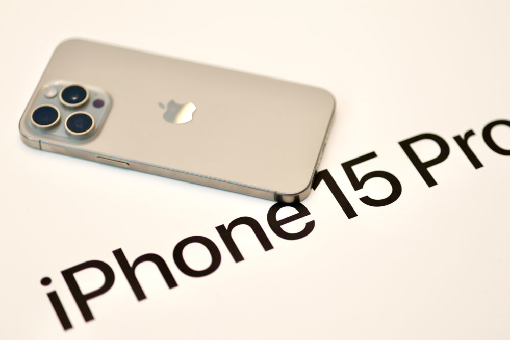 今年のiPhone 15シリーズはどれも美しいので、ぜひ実物を見て、色を選んでいただきたいなって思います。こっちが、チタニウムボディのiPhone 15 Proシリーズ。