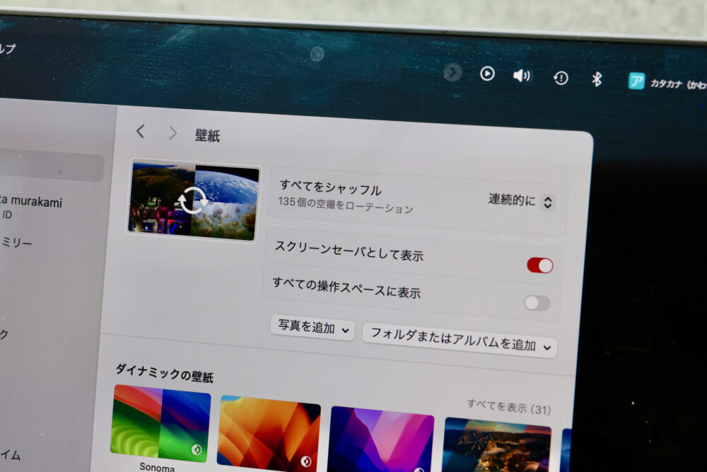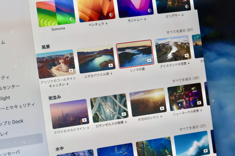 ぜひ、macOS Sonomaのスクリーンセーバーをランダムで表示して世界旅行気分を味わっていただきたい。歴代最高に美しいスクリーンセーバーと壁紙だと思う。