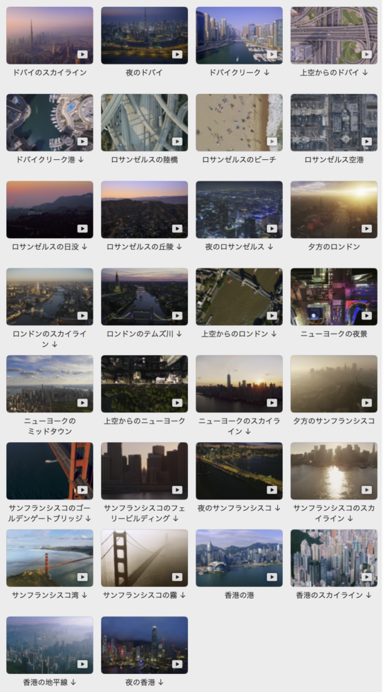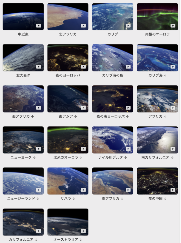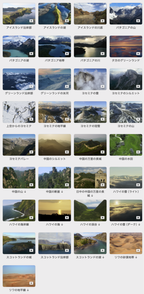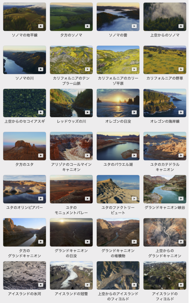 Apple TVをお持ちの方は、空撮動画がスクリーンセーバーとして使われることに馴染んでいると思うが、あれと同じような映像がMacでも楽しめるのだ。