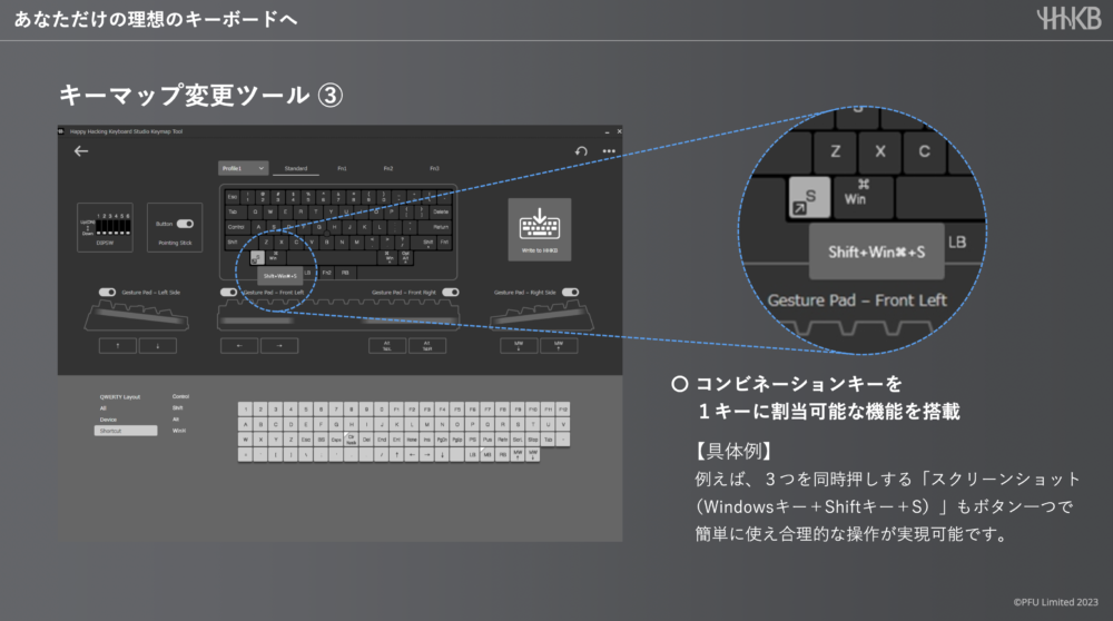 また、各キーにはキーコンビネーションも割り当てられる。たとえば、ひとつのキーに『⌘+シフト+5』(画面一部分のスクリーンショットを撮る)というようなアクションを割り当てることも可能。Adobeのアプリのような数多くのショートカットを使いこなす必要のあるアプリでも、特定のプロファイルやFnとの組み合わせで、さまざまなキーにショートカットを割り当て、HHKB Studioを左手デバイスのように使いこなすこともできるのだ。