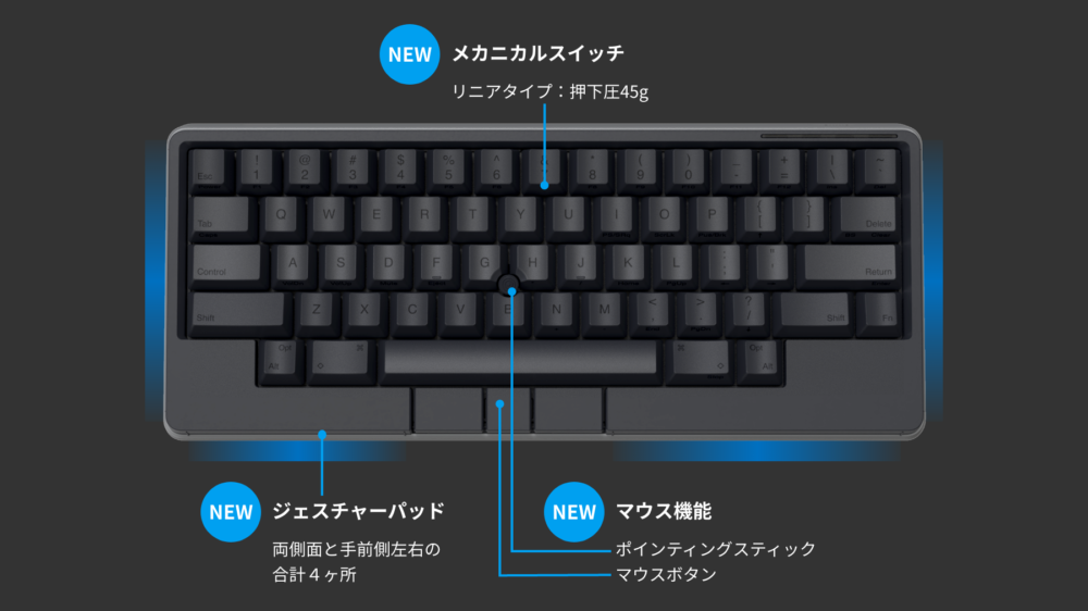 特に特徴的なポイントが2点。キーボード中央部に設けられたポインティングスティックと、両側面と手前側左右に割り当てられたジェスチャーパッドだ。
