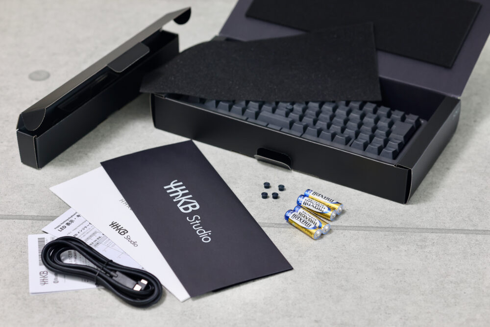 そう、従来のHHKBは単3乾電池2本で動作したが、HHKB Studioは単3乾電池4本を必要とする。USB-Cケーブルは片側がL字となっている。親切。