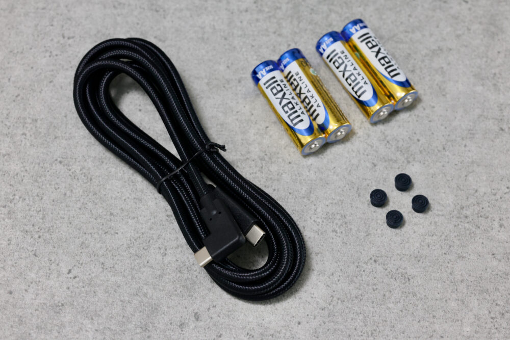 中身は本体の他には、乾電池4本と、ポインティングスティックの予備、丈夫そうなUSB-Cケーブル、そして、いくつかのペーパーが同梱されている。
