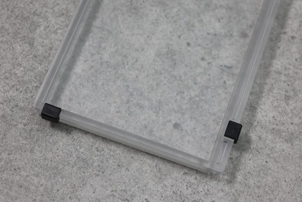 今回のゴム足はサイド部分にしっかり噛み合うように取り付けられるので、落としてしまう心配がない。また、縦面と横面にそれぞれ付けられているので、カタつきにくく、安定して装着することができる。