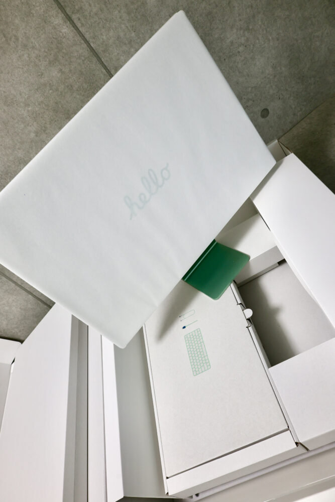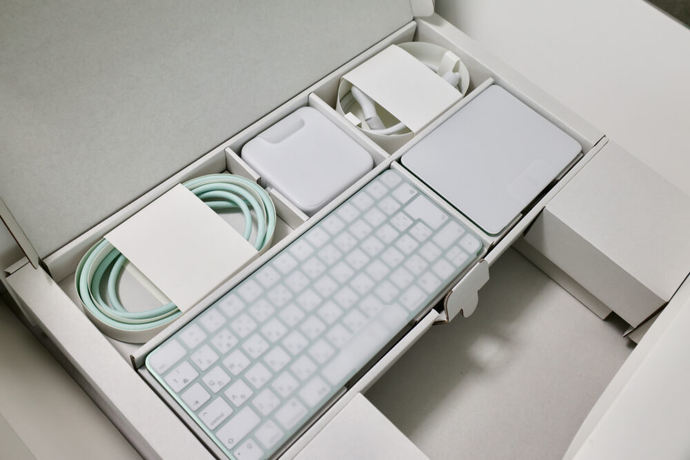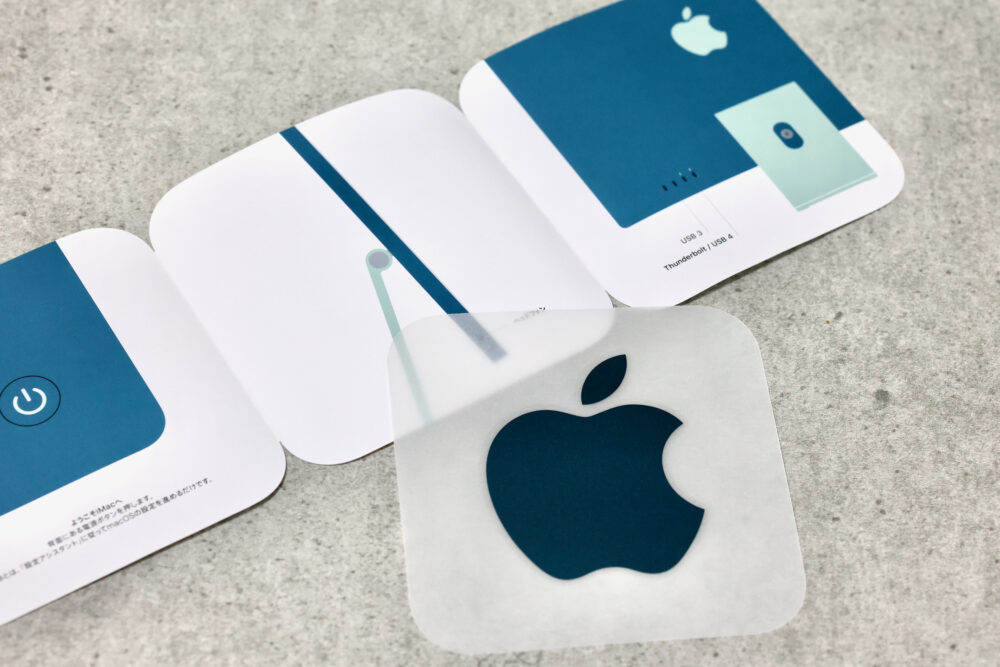 このカラーコーディネートは実に徹底されていて、本体、パッケージはもちろん、電源ケーブル、同梱されるMagic Keyboard、Magic Mouse、Magic TrackPad、その充電用のLightningケーブル、ステッカー、取扱説明書、画面保護のために貼ってあるフィルムの『Hello』の文字にいたるまで、それぞれの色に統一されいてる。在庫管理の手間を思うと気が遠くなるが、この統一性は購入した時の喜びを増やしてくれるだろう。