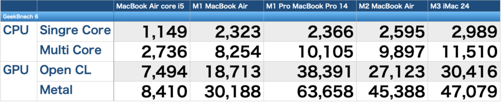 過去のデータと較べてみると、CPUのマルチコアはM1 Pro(データはCPU 8コアのモデルだが)を凌駕しているし、GPUもM1の60%増し。14コアのGPUを持つM1 Proと較べてさえ75〜80%ぐらいの処理能力を持つことになる。つまり、初代のiMac 24インチと違って、よりビデオ編集などもバリバリできる性能に近づいているということになる。