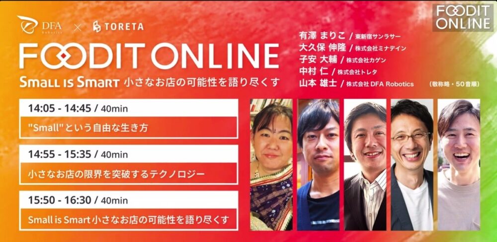 FOODITの話は、テクノロジーの側面だけではない、人間味のある『店舗経営の話』がたっぷり聞けて、とても面白かった。どうしても、労働負荷の大きくなりがちな飲食店経営だが、テクノロジーをうまく活用することで、まだまだ新たな可能性が広がりそうで、非常に面白かった。次はリアルイベントとしての開催を期待したい。