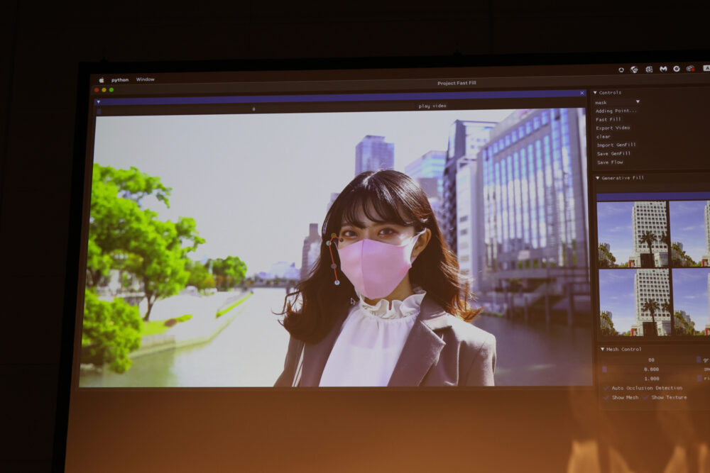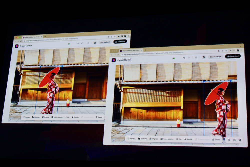 Project Stardustのデモもすごかった。下の写真を見れば一目瞭然。京町家の前を歩く着物の女性を移動させることができる。つまり、遠近を把握して女性をキリヌキし、移動させたあとに、女性のいた場所の背景を自動生成できるのだ。