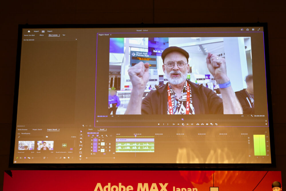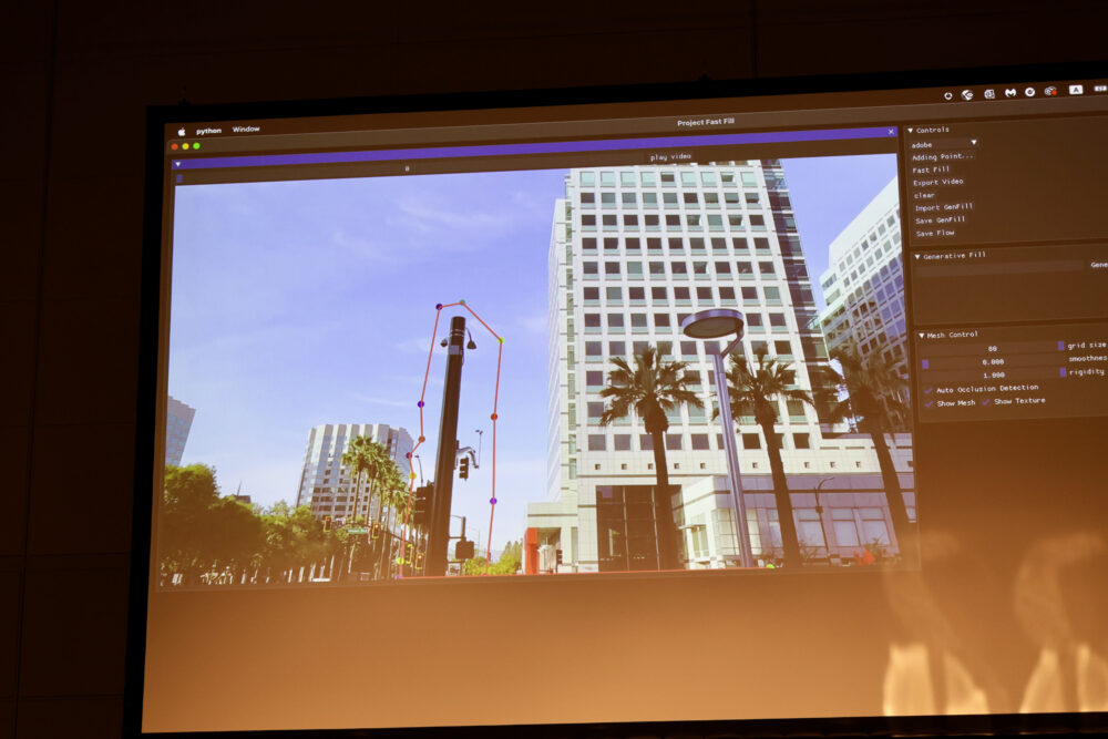 その他、Sneak Previewとして、Adobe Sensei GenAIを使って、動画の音声、BGM、観衆の声などを切り分け、それぞれに個別にエフェクトをかけたりできるProject Sound Lift、生成塗りつぶしを動画で行うProject First Fill(動画から、電柱を消したり、人の顔からマスクを消したりできる(ホンマか!?))、などの技術が発表された。いずれも魔法のような技術だが、近いうちに実現するのかもしれない。