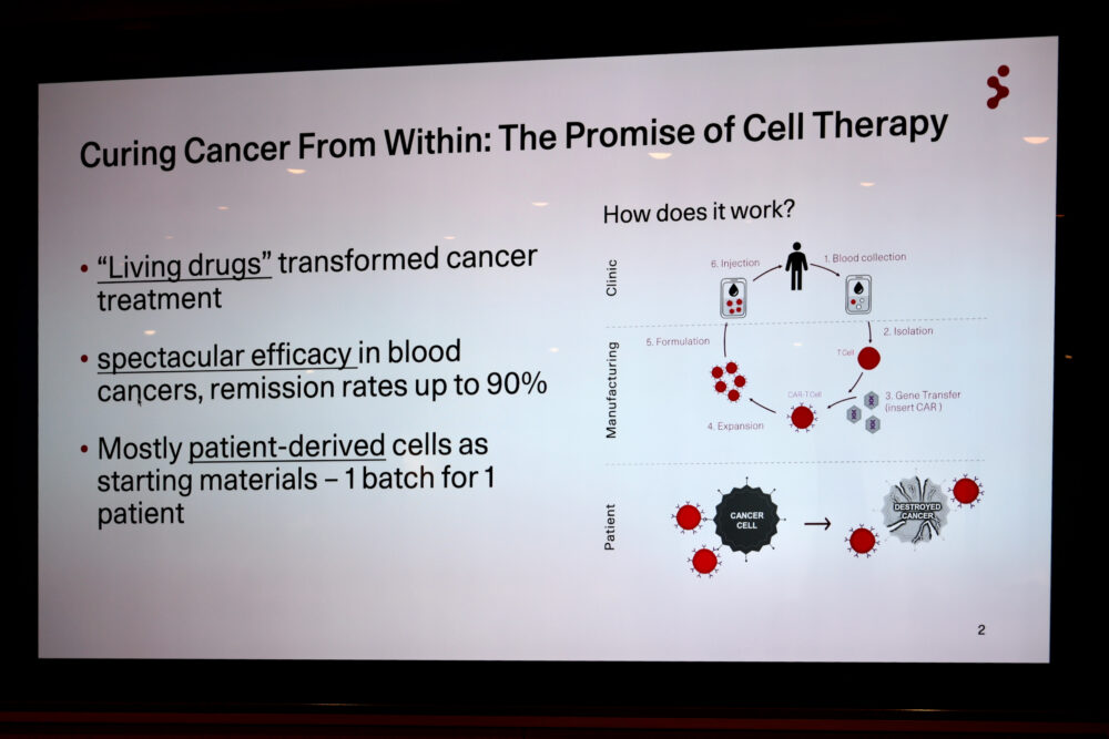 Sarcuraは細胞療法をローコストで大量生産できる生産技術。本人の免疫細胞を完全に機能する状態にした薬として、身体に入れることでガン細胞を治療する手法で、多くの大手製薬会社が、細胞療法の薬の開発にお金をかけている。血液のガンに対して最大90%の寛解率を発揮するなど画期的な治療法ではあるが、非常に高価格で、ほとんどの保険ではカバーされない。