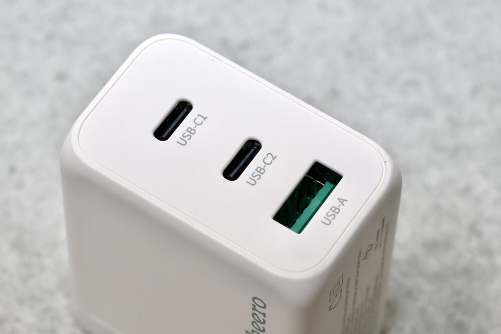 次に、2ポート同時に使用する場合は、一番上の『USB-C1』ポートの方が大出力(45W)を発揮する。『USB-C2』『USB-A』を一緒に使うと出力が非常に制限されるので注意されたい。