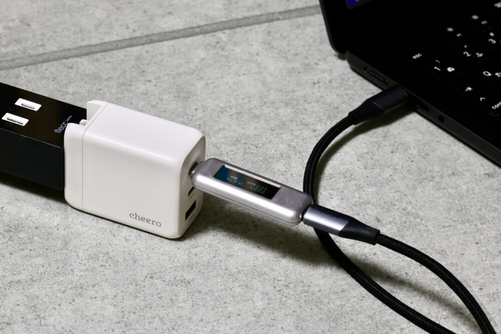 まず、最大出力の65Wを利用しようと思うと、E-marker(認証チップ)を内蔵したケーブルが必要だ。Macの充電用のケーブルなどを使えば大丈夫だが、何も書いてない一般的なケーブルは60Wまでしか使えないことが多い(この場合、それでも充分だが)。