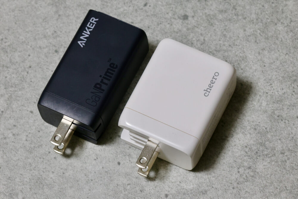 近いスペックであるAnkerのAnker 735 Charger (GaNPrime 65W)と比べてみるとご覧のように厚みは同じで、Anker735 Chargerの方が長くて、cheero 65W GaN 3 ports USB PD Chargerの方が幅が広い。重さは、Ankerが約132g、cheeroが約110gで、cheeroの方が軽い。