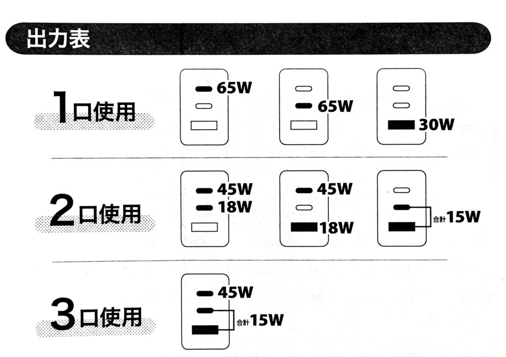それゆえ、このcheeroの最大65W、2ポート使用で45Wと18W、3ポート使用で一番上のUSB-Cから45W、下の2つのポートの合計で15Wという組み合わせはとても便利なのだ。