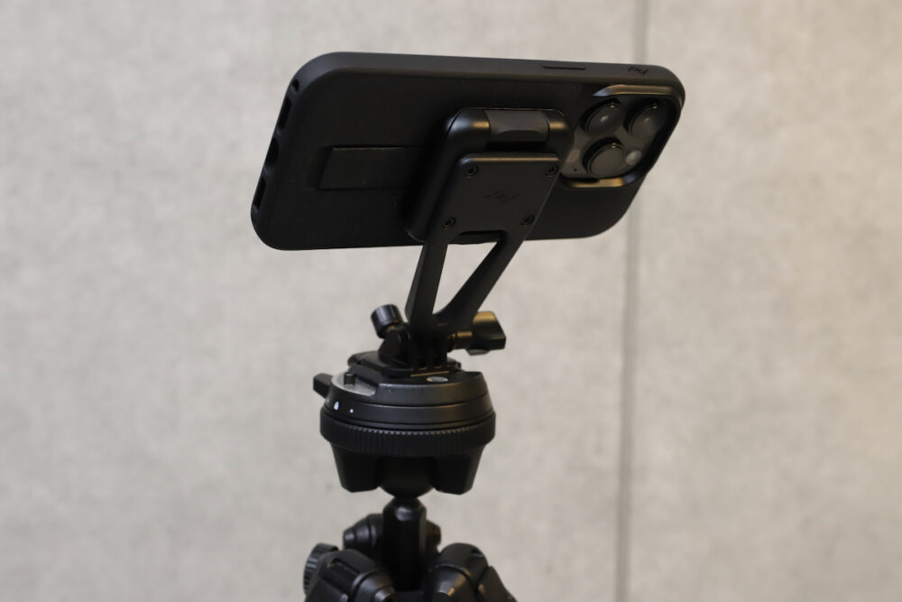 クリエイターキットはSlimLinkのハードロックを利用してMobileケースを固定する。基部は、GoProマウントと互換性があり、同梱のアルカスイス互換プレートや1/4 インチネジ穴付きプレートを組み合わせることで、さまざまなマウントにiPhoneをしっかり固定できる。