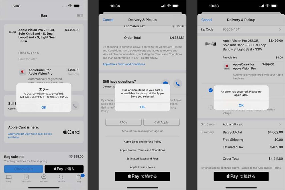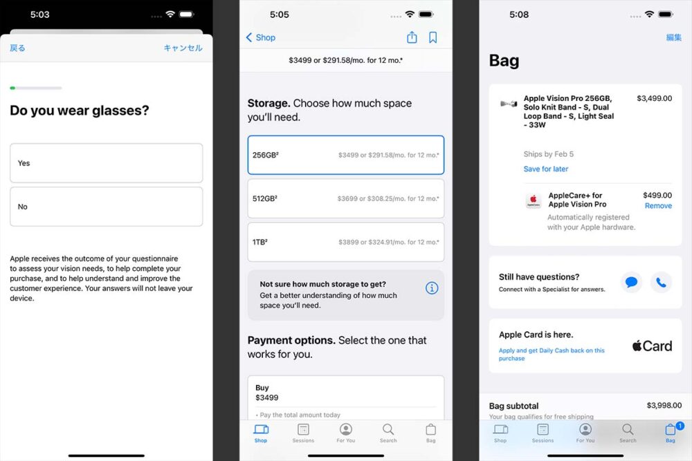 さらに購入方法(一括払い、分割払い)、アップルケアなどの質問が続く。果たして、1年後もこのまま使っているか? それとも何らかのアップデートをしているのかよく分からなかったが、とりあえず50万円のシロモノなので、アップルケアには入ることにした。