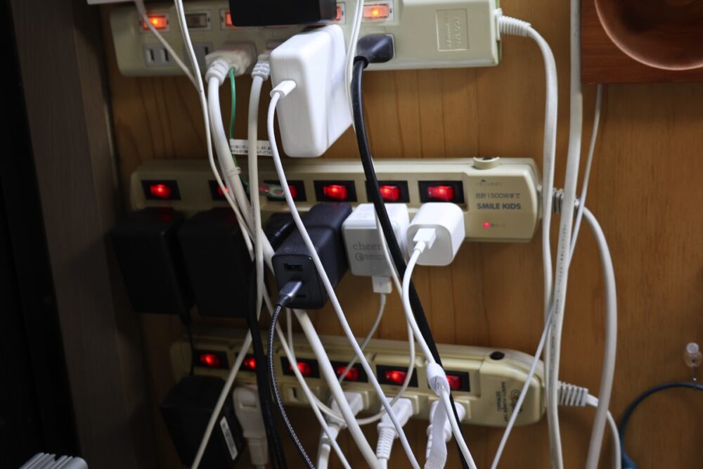 ちなみに、筆者のデスクの電源まわりはご覧のような様子だ……。試用機のテストなどもあって、たくさんの電源が必要(たとえばiPhoneの発売時には4台同時に充電しなければならない)だという事情はあるが、それにしても、もうちょっとなんとかしたいところ。