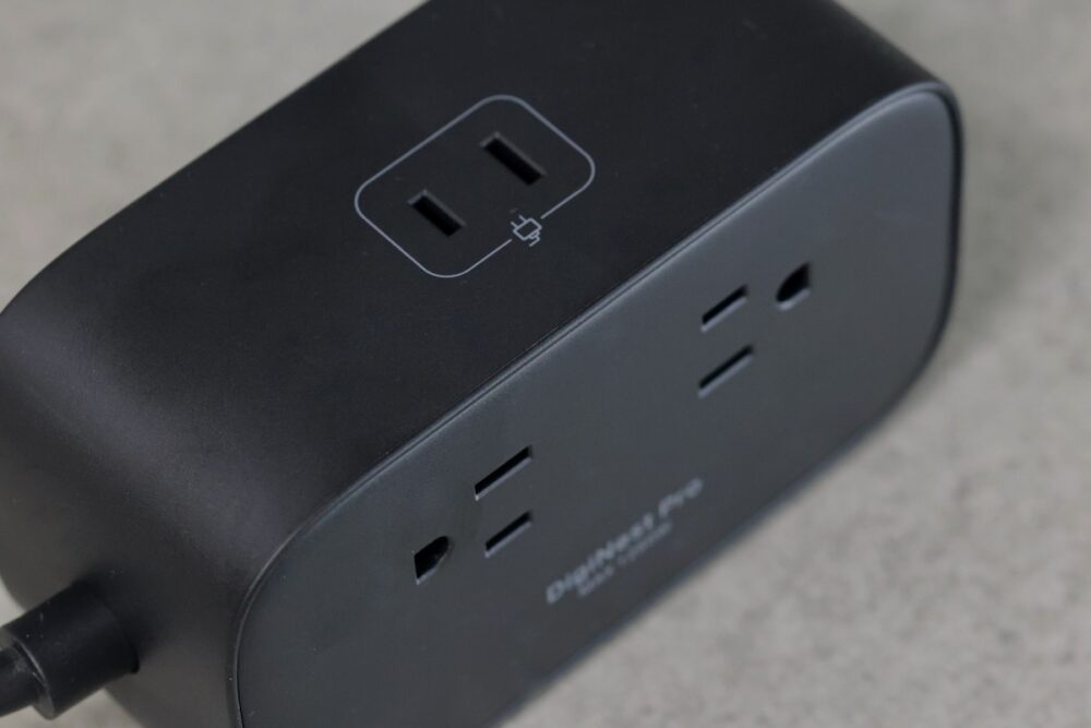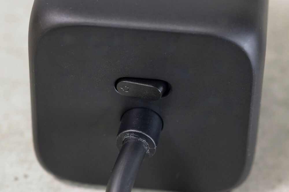 小さく前面に書いてあるが、USB-Cで100W出力(パソコン用)が出るのは左の2ポートのみ。しかも、2ポートとも使うと片側が65W、もう片側が30Wになる。詳しくは説明を読んでいただきたいが、なるべく多くの端末を繋ぎっぱなしにせず、必要なものだけ、左のポートを優先して接続するようにしたい。