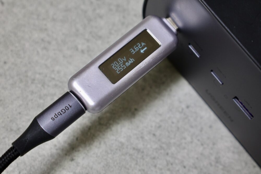 USB-CポートにMacBook Proを接続して電流を計測してみたが、十分に高い電圧を得ることができた。実際には出力はパソコン側の電池残量などにもよるので一概にはいえないが、とりあえず接続してみて20V× 3.62A(おそらく最大5A流れる)=72.4W出ていた。