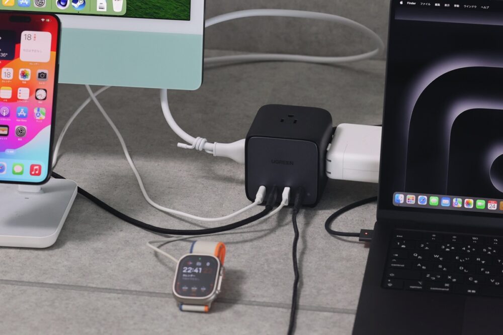 写真では撮影のために、目立つ配置にしてしまっているが、これ一台でiMac、MacBook Pro、iPhone、iPad、Apple Watch……といった周辺機器全部に電力を供給することができる。