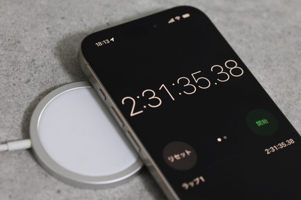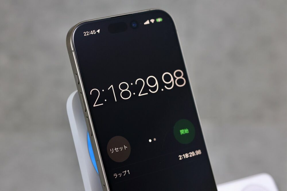 筆者使用のiPhone 15 Proの充電残量を0にしてから、満充電になるまでの時間を、iPhone内蔵のストップウォッチで計測する。