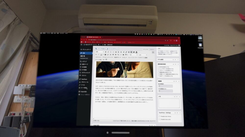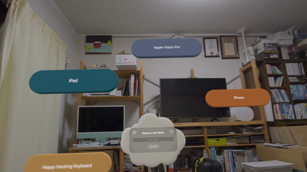 たぶん、Vision Pro単体でも書けるようになるとは思うが、現時点では日本語入力が少々手間なので、MacBook ProにHHKB Studioを接続しているのを、まるごとVision Proに表示して書いている。