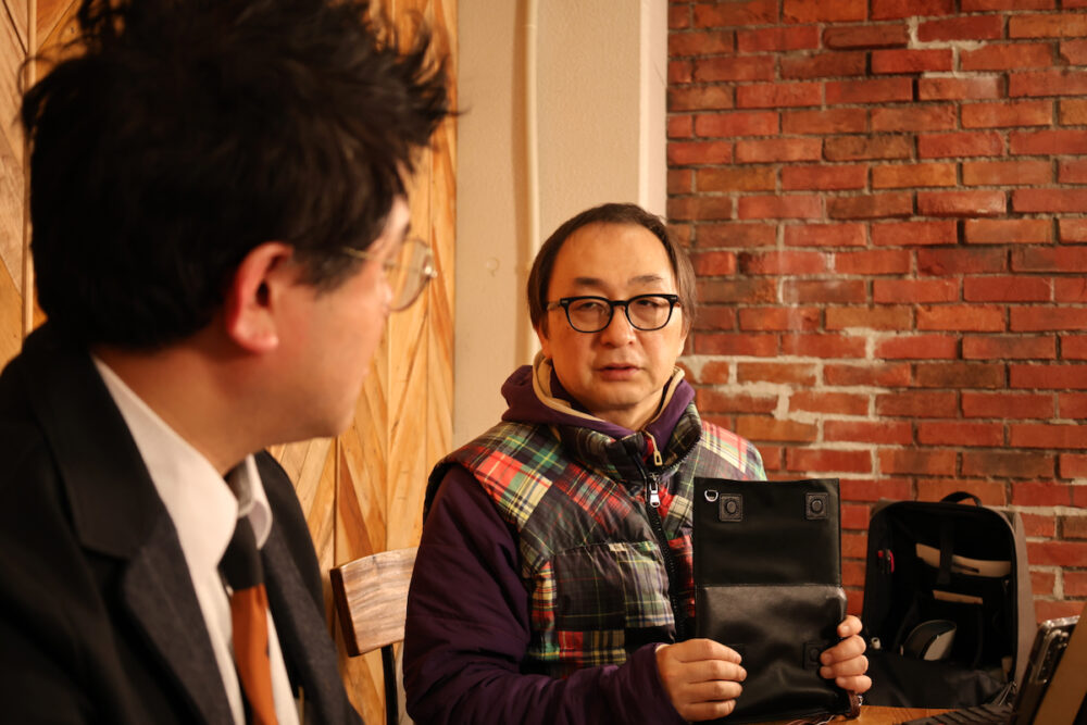 関連して、ワイヤレスイヤフォン、場合によっては予備としてモバイルバッテリーを持たなければならない。今時はマスクも必要だ。スマホを率先して使い始めた我々が、この問題を解決しなければ……ということで、いしたにまさき、矢崎飛鳥、村上タクタの3人のプロジェクトであるサンボル商会ではサコッシュを開発することにした。安っぽいものでなく、普段身に着けていられる上質なもの……ということで、革製にしたいと思った。
