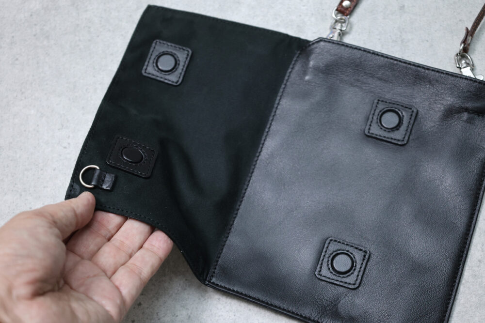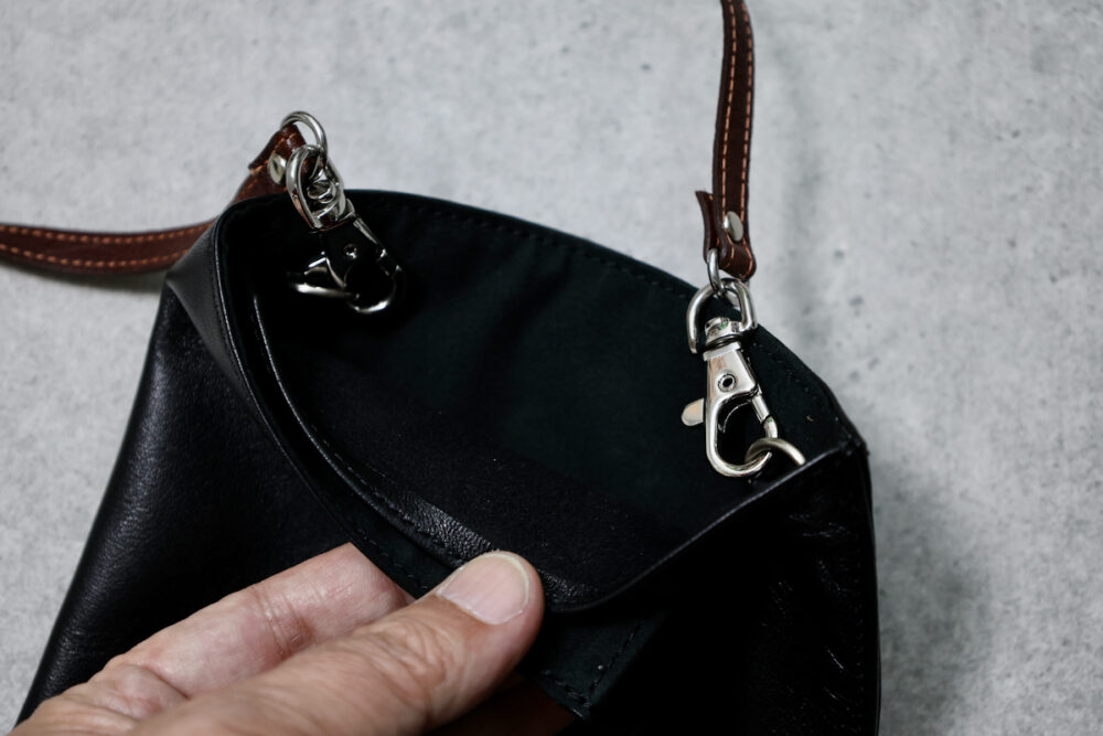 たしかに、入れるものの大切さを考えるとファスナーは欲しいが、この「スルっ」と入る感じも捨て難い。ストラップの長さもどのぐらいにするか迷うところ。長めにした方が出し入れしやすいが、短めの方が身体にはフィットする。身体から離れない、フィットする感じも大切だ。