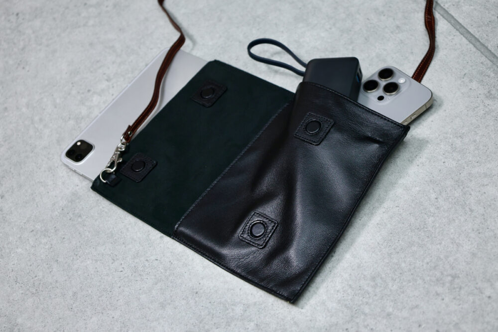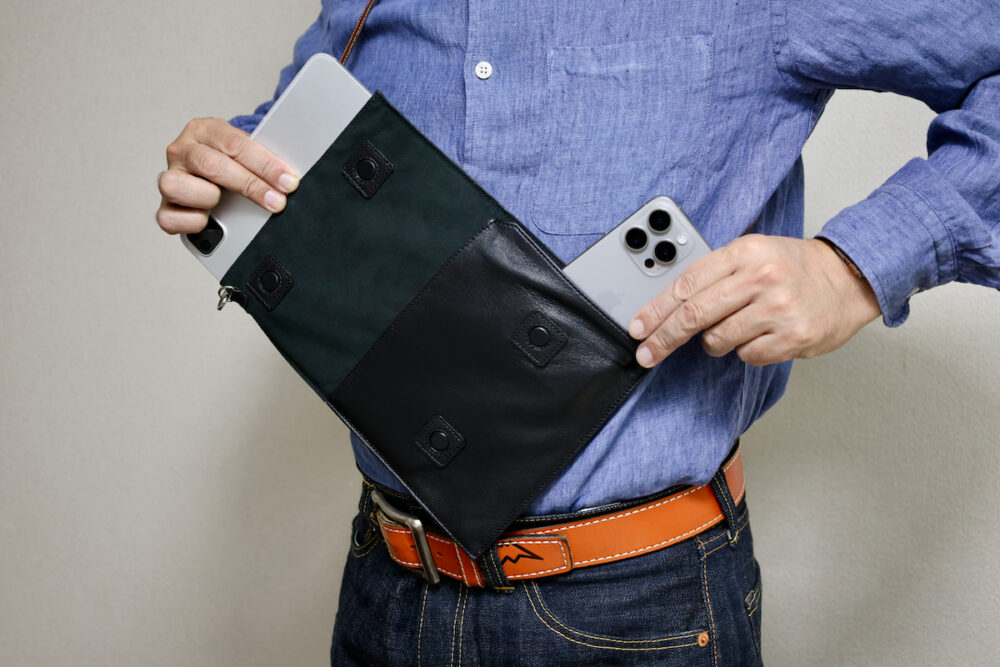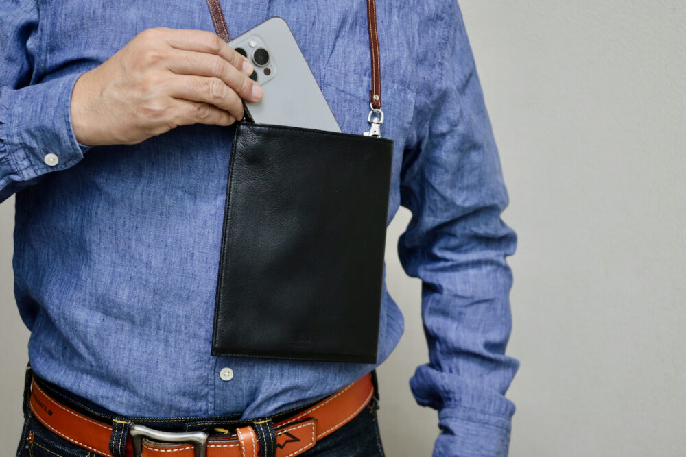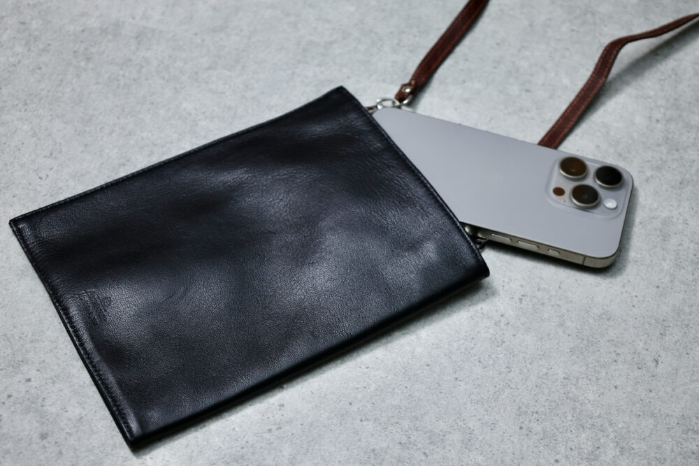 iPhone 15 Proを入れてみたが、もちろんiPhone 15 Pro Maxなど大きいスマホでも全然問題ない。バッグは持ちたくない、でも手ぶらで出られないというシチュエーションにピッタリのサイズ感と質感だ。