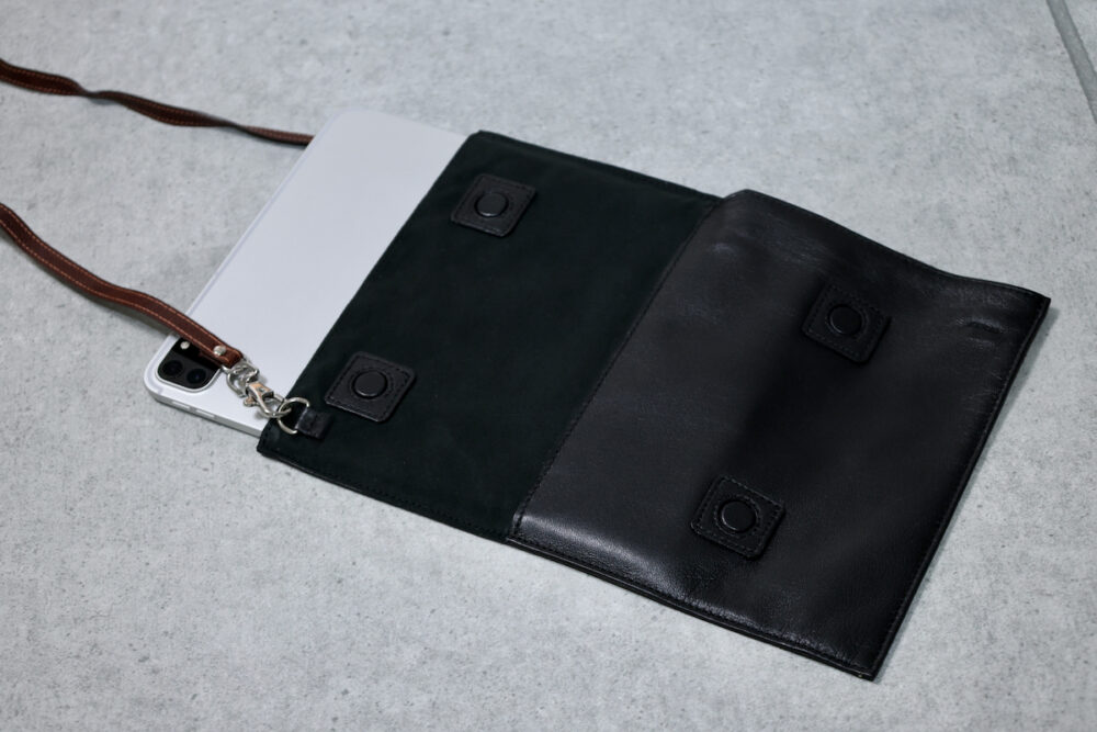 とはいえ、サイズは実はギリギリ過ぎて、iPad Pro 11インチにピッタリフィット。これでは出し入れに苦労してしまう。また、iPad Proをケースに入れて使う人もいるだろうし、そういう人が入れられない。あまり無駄に大きくするとスタイリッシュさが損なわれてしまうが、もう少しは大きくした方がいいだろう。