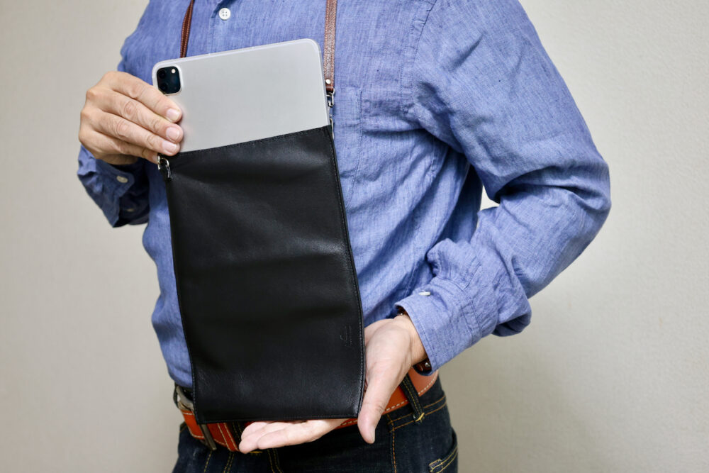 さっきまで、iPhone 15 Proにピッタリだったサコッシュに、iPad Pro 11インチがすんなり入る! これぞ、我々が求めていたサコッシュだ。