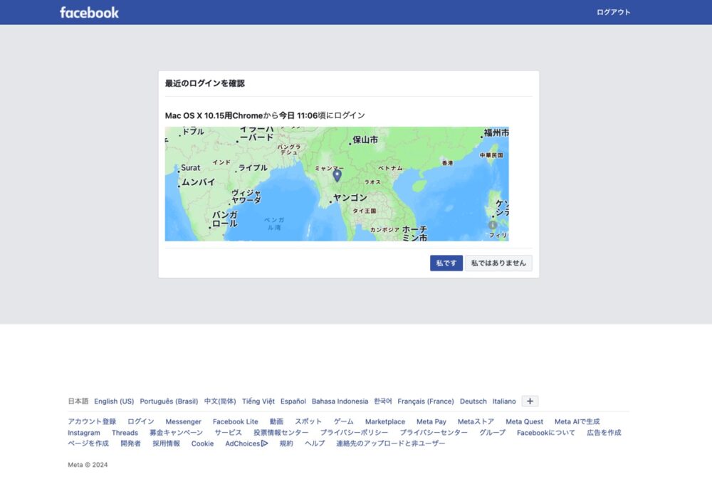 ただし、パソコンからFacebookを見ようとした場合に、数日に一度、弾かれて「ミャンマーからのアクセスです。許可しますか?」というメッセージが出ることがあった。