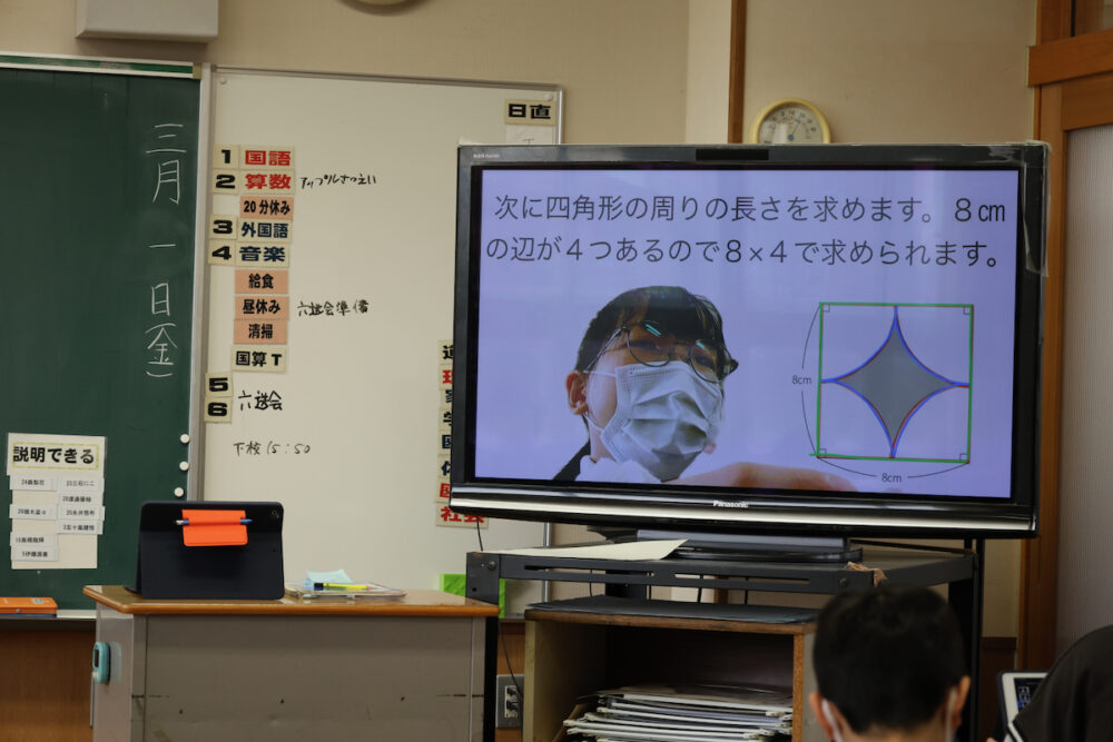 iPadの画面を、教壇に置かれたディスプレイにミラーリングし、プレゼンテーションする。プレゼンの中に、ライブビデオというカタチで自分の姿を投映したら、テレビのニュースのように自分の姿がスライドの前に表示される。子どもたちはちゃんと分かっていて、スライドに自分が表示される部分を設けてある。こうすれば教壇の方に出向く必要もない。