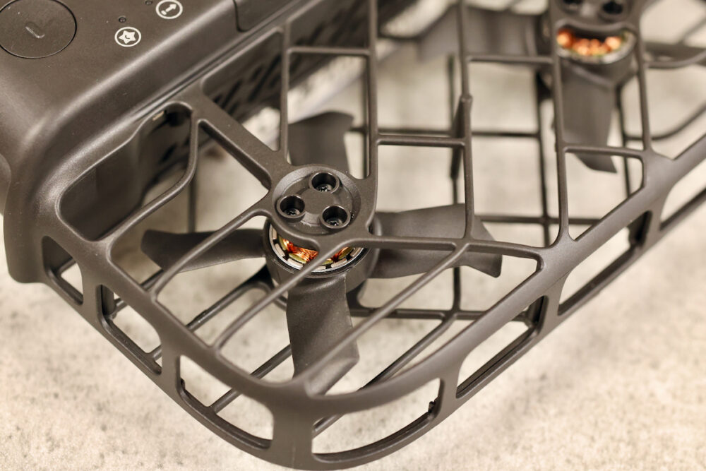 本体は本当に小さくて、よくこれで飛行性能を確保できるな……と感心する。4枚のローターは鳥カゴのようなフレームに覆われていて、何かに当たってもローターが壊れるところはなさそうだし、人に当たっても怪我させる可能性は低そうだ。