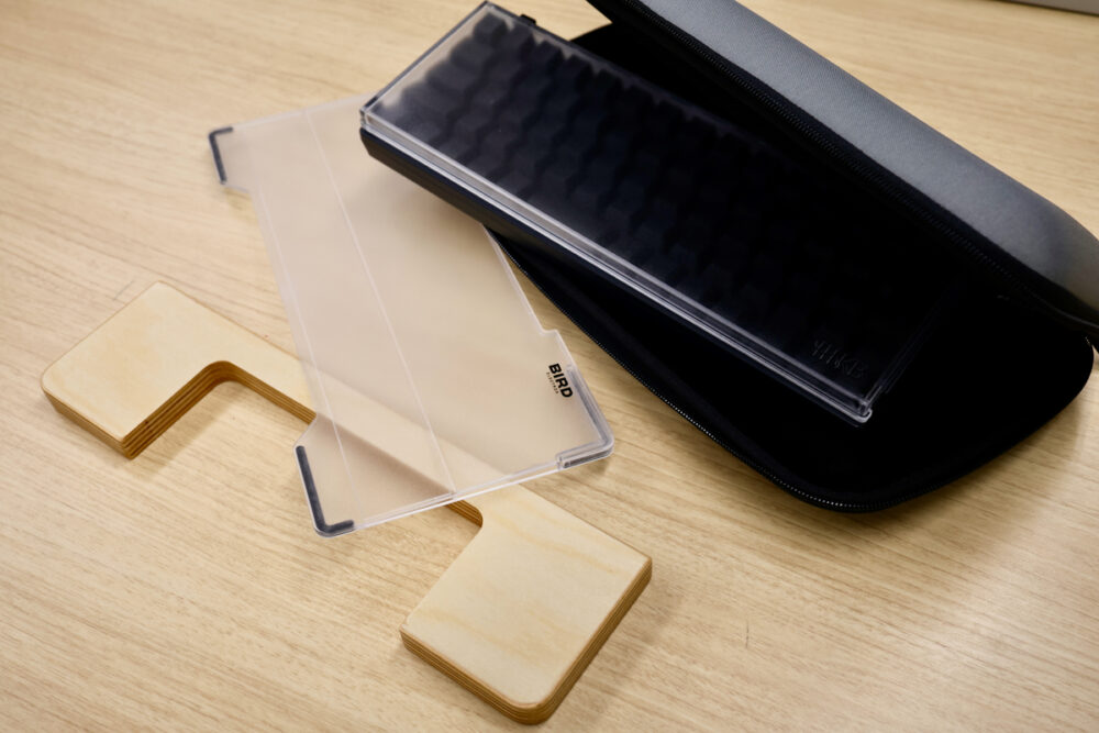 HHKBを持ち運び時にキーボード面を保護できるうえ、使わない時にほこりや汚れ、さらにはペットから守ってくれる。HHKBと接する面に緩衝材になる大型のエラストマーゴム製のパーツが装着されているのも◎。材質は3mm厚のポリカーボネートで、サイズは292×106×13mm、重量は約130g。