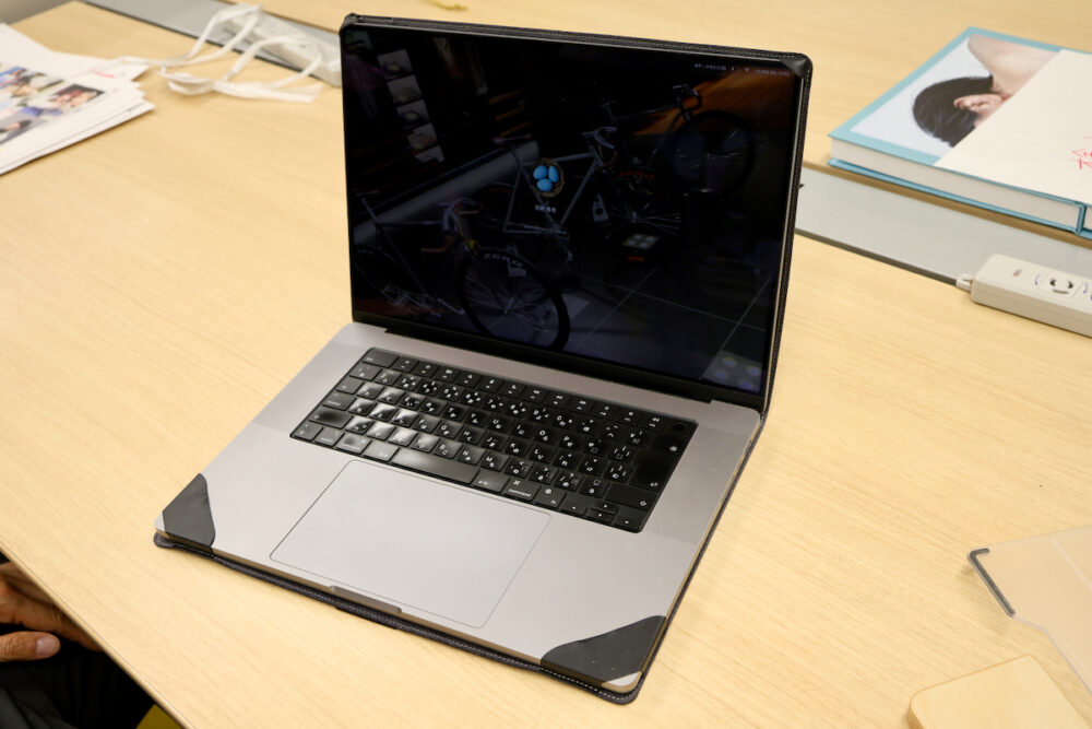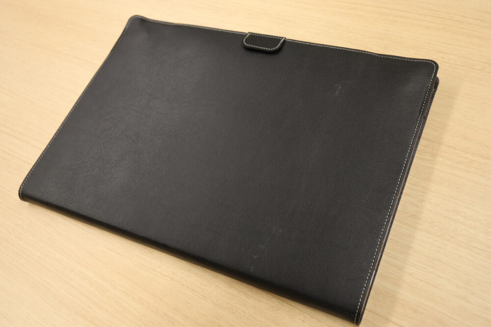 簡単に装着できるレザーカバーは、マックであることを隠せるだけでなく、生活にこだわりを持っている人っぽく側から見られそう。実用面では、素足の上にパソコンを載せる際、“冷たい!!”とならなくていい。これ意外とうれしい。