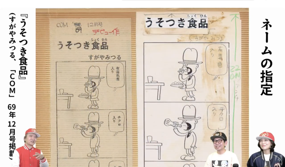 写植文字を用意してもらうのに、右のように指定を書きこみ写植をその指定のとおり打ってもらい、それを貼り込むという作業を行った。ちなみに、この『うそつき食品』は、COMの連載作家が締切に間に合わず誌面に穴を開けたため、すがや先生が「急遽描いた」ものだそうだが、見事掲載され、先生のデビュー作となったのだそうだ。