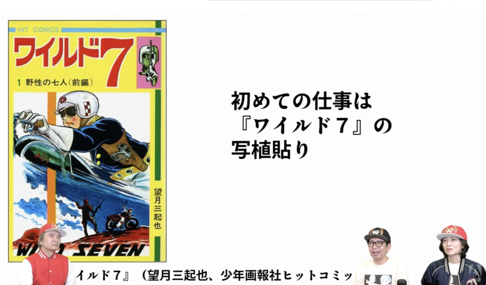 職歴のスタートは、マンガ家ではなく、編集プロダクションに入っての仕事だったそうで、なんと初めての仕事は『ワイルド7の写植貼り』とのこと。