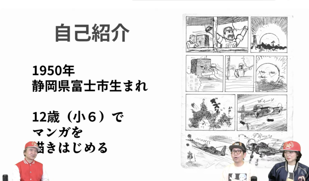 まず、自己紹介からしてすごい。右側の図版は、先生が小学校6年生の時にはじめて描いたマンガだそうだ。1950年生まれだから、なんと1962年のマンガ!