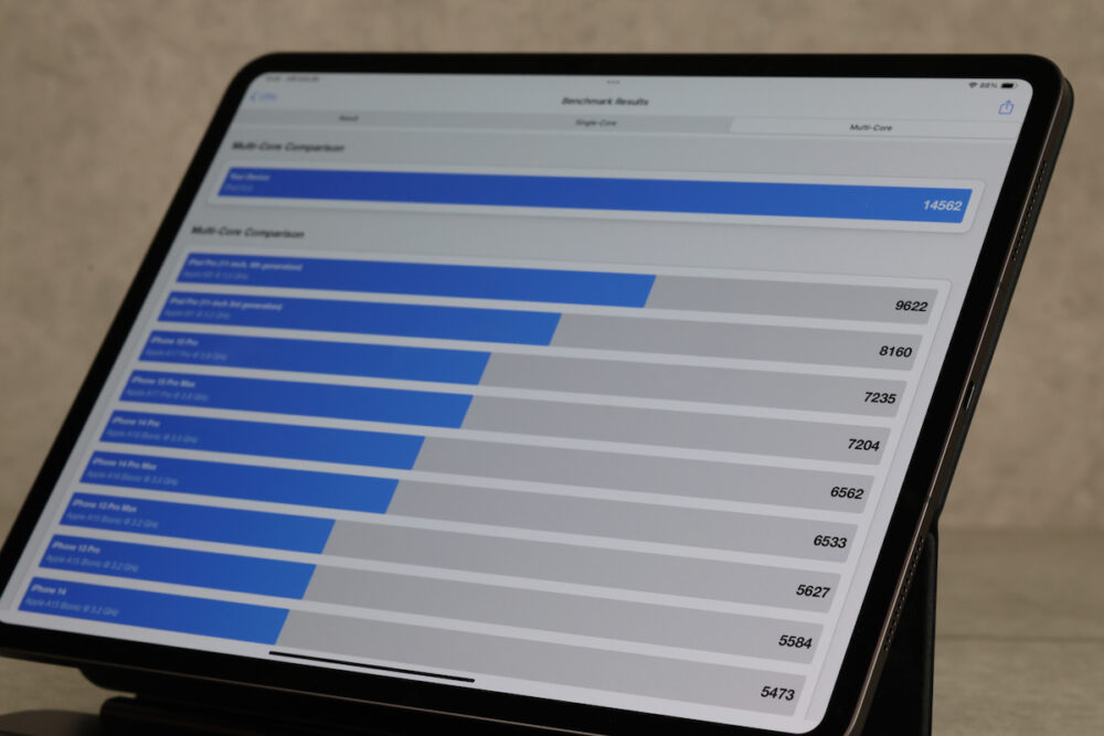 スペックは、GeekBench 6で試してみたいが、ご覧のように前モデルのiPad Pro(M2)と比べて、マルチコアのCPUスペックで50%も速くなっている。M3の分を1世代スキップしたとはいえ、わずか1年半で50%の性能向上には驚く。