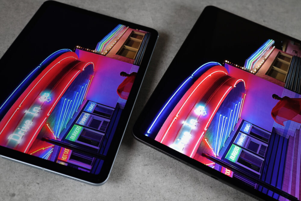 左がiPad Air(M2)、右がiPad Pro(M4)。写真だと、iPad Pro(M4)の方が白飛びしているように見えるかもしれないが、実際には明るい部分も階調があって圧倒的に美しい。また、暗い場所でみると、iPad Air(M2)の方が黒い部分がわずかにグレーだ。iPad Pro(M4)はしっかりと黒に見える。