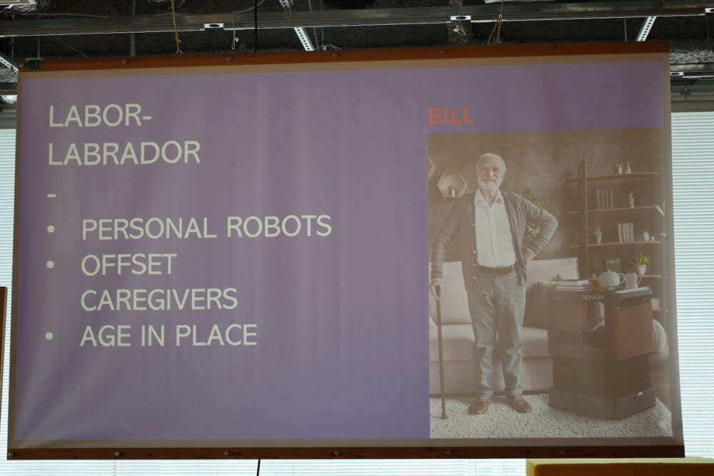Abbie Richieさんは、非常にポジティブな視点で高齢化社会を捉えていて、海外で行われているエイジテックの実例をいろいろ説明された。たとえば、こちらは家庭内で運搬などを手伝ってくれるロボット。