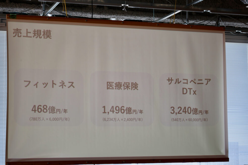 高齢者社会を迎える日本にとって、サルコペニア抑制は、医療費の低減、健康寿命の延長ということで、非常に大きな意義があり、市場規模も大きなスタートアップだといえる。