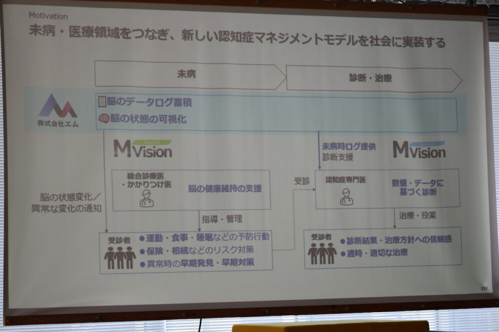 医療は、従来『起きてしまった、致命的な病』を治療することにフォーカスしてきたが、むしろ『病にならず、健康的に生きられる状態』を維持した方が、健康寿命は伸びるし、社会的なコストも下がるはずだ。エムビジョンは、未病時の診断に大きく貢献するというわけだ。