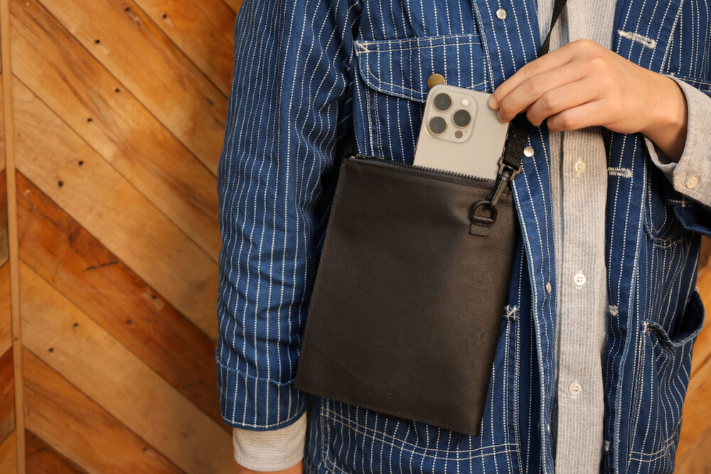 携帯やスマホ登場前は、人が肌身離さず身に着けるものは財布、カギ、ハンカチ……といったものぐらいだった。しかし、この10〜20年で、我々人類はスマホを持ち歩くようになった。にもかかわらず衣服やバッグはその生活の変化に合わせた進化をしていない。というわけで、サンボル商会ではポケット+アルファの、『+アルファ』の部門を担うサコッシュを作ることになった。