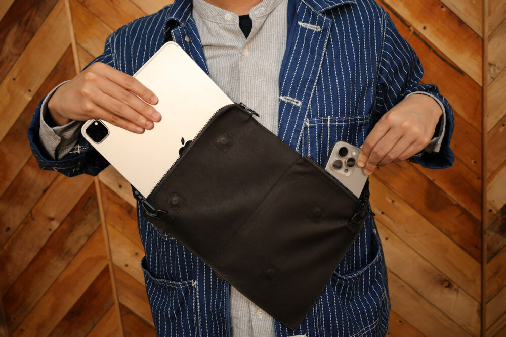 スマホ、もしくは『+アルファ』で身に着ける小物を入れることを想定。スマホや、モバイルバッテリー、ワイヤレスイヤフォンなどが入る大きさを検討した。さらに、展開することで、11インチiPadぐらいのサイズのタブレットも入れられるようにした。