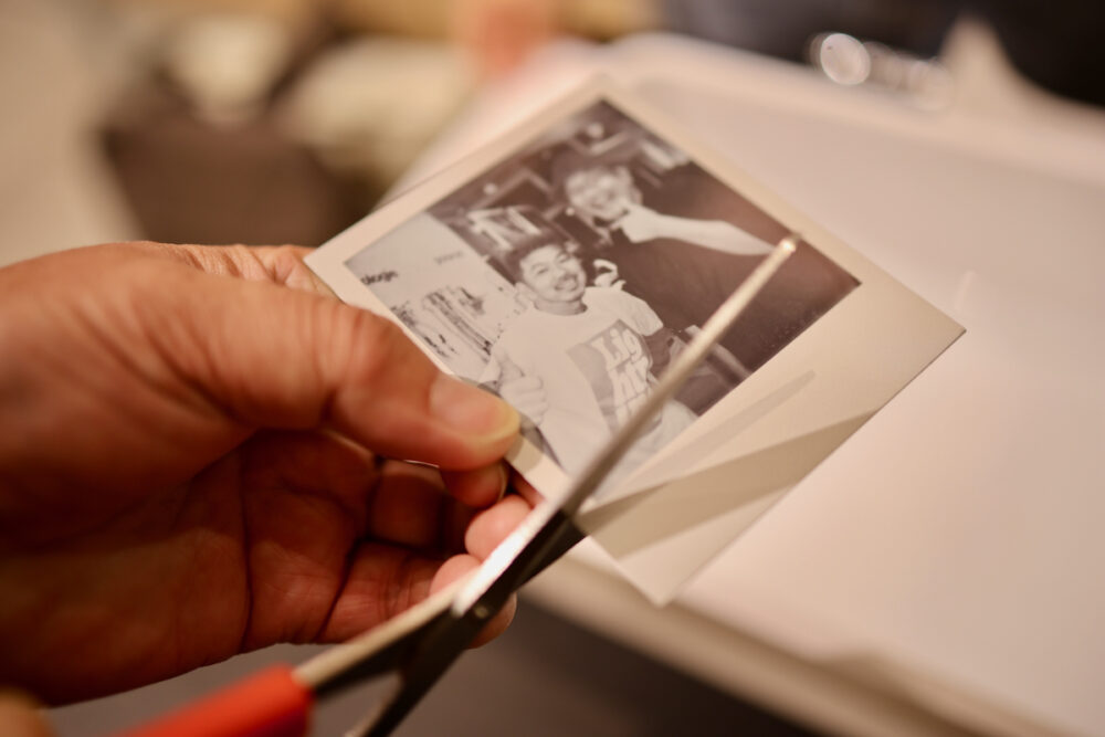 まず、ポラロイドカメラで写真を撮る。ここでは、クラファン中の『Polaroid I-2』で撮ってもらった。『Polaroid I-2』は一般的な一眼レフのように、絞り優先にしたり、露出を調整したりできるので、こういう作品作りには向いている。